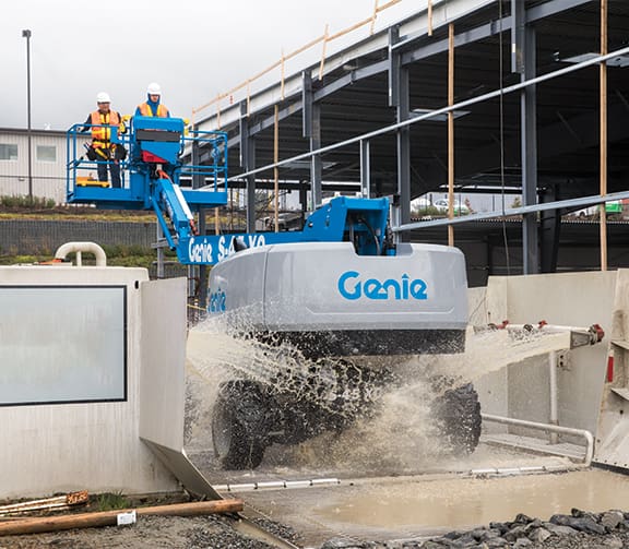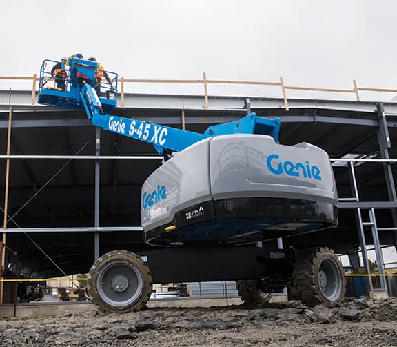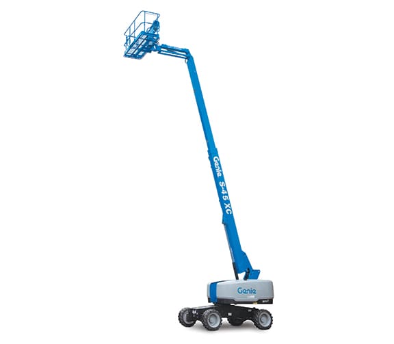 The Genie S-45 is a telescopic boom lift built to give crews strong reach, precise positioning, and more flexibility across a range of outdoor jobsites. Depending on the configuration, it can be set up for sensitive ground conditions with the HF model, heavier lifting with the XC model, or improved traction on soft and uneven terrain with the TraX track system.